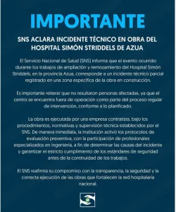El Servicio Nacional de Salud (SNS) informó que el hecho se debió a un incidente técnico parcial ocurrido en un área específica de la obra, durante el vaciado de la losa correspondiente al segundo nivel de la edificación, donde se ejecutan labores de ampliación y adecuación.