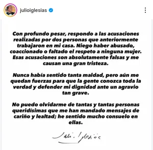 En su declaración pública, su postura es de negación total. Iglesias afirma: “Niego haber abusado, coaccionado o faltado el respeto a ninguna mujer”, califica las acusaciones de “absolutamente falsas” y anuncia que luchará para que “se conozca toda la verdad”.